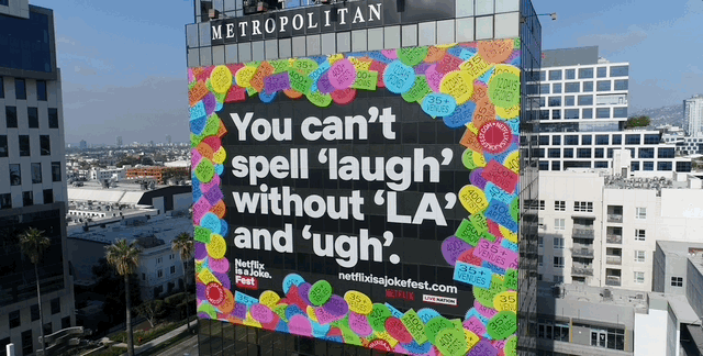 Building on the foundation of the Netflix Is a Joke brand, the 2024 Fest identity expanded that world into a citywide event system—one that could connect hundreds of shows, venues, and experiences across Los Angeles. The challenge was to create a visual language bold enough to cut through an ad-saturated city, yet flexible enough to live everywhere: on billboards, venue signage, coasters, merch, digital banners, and beyond. The result, Slap, Stick, anchored in the brand’s black-and-white DNA but layered with bursts of irreverent color and tactile sticker graphics that carried copy, jokes, and wayfinding. It became the connective tissue of the festival—instantly recognizable, wildly adaptable, and unmistakably Netflix.